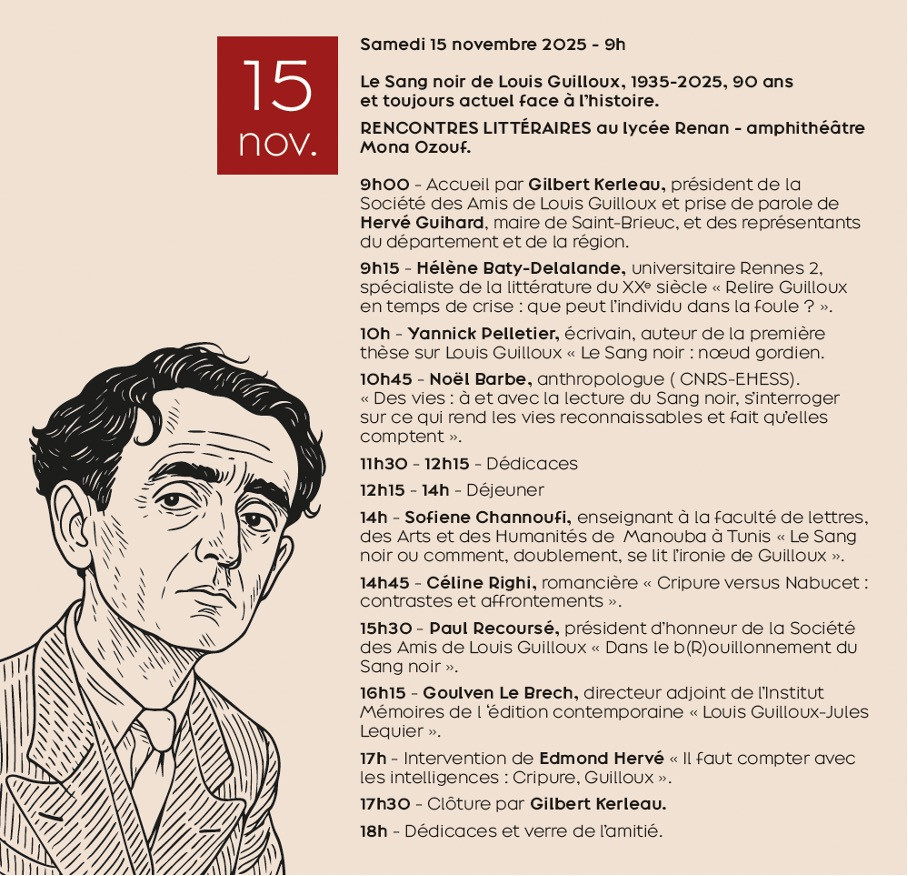 9h00 – Accueil par Gilbert Kerleau, président de la Société des Amis de Louis Guilloux et prise de parole de Hervé Guihard, maire de Saint-Brieuc, et des représentants du département et de la région.